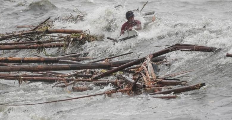 epa07021459 A man is hit by a wave while attempting to recover salvageable materials in Manila Bay, Manila, Philippines, 15 September 2018. Mangkhut, the most powerful typhoon to strike the Philippines in the last five years, made landfall in the northeastern town of Baggao with maximum sustained winds of 205 km/h (128 mph) and gusts of up to 285 km/h (177 mph). The Category 5 storm came ashore at 1:40 am (17:40 GMT on 14 September) in Cagayan province, the Philippine Atmospheric, Geophysical, and Astronomical Services Administration (PAGASA) said. Mangkhut, denoted Ompong in the Philippines, is moving west-northwest at 35 km/h and is expected to exit the archipelago in the direction of Hong Kong late 15 September, according to the PAGASA bulletin. Forecasters said that coastal areas in the impact zone could experience a storm surge of as much as 6 meters. EPA-EFE/MARK R. CRISTINO